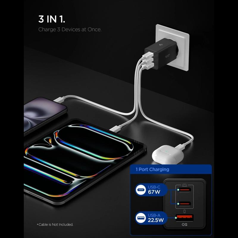 Spigen Essential EE673EU 3-porttinen seinälaturi - 67W GaN Pro -pikalaturi kahdella USB-C- ja USB-A-liitännällä