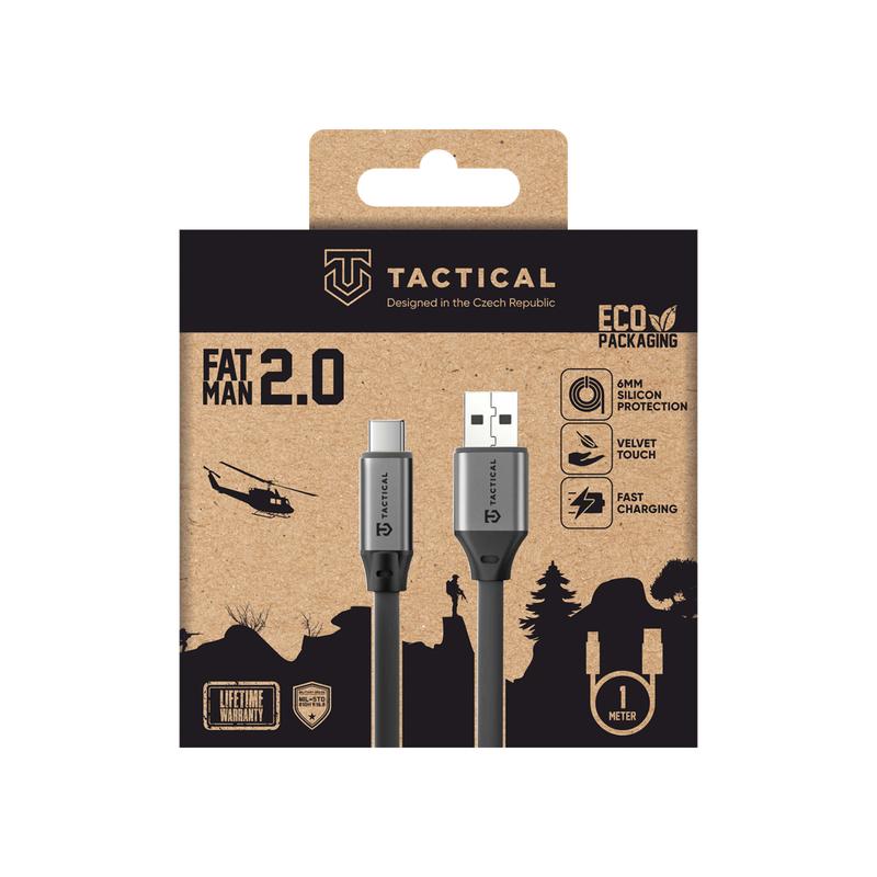 Tactical Fat Man 2.0 on kestävä USB-A-USB-C-kaapeli, joka on suunniteltu luotettavaksi käytettäväksi vaativissa olosuhteissa. Se on tarkoitettu puhelimien, tablettien ja kannettavien tietokoneiden lataamiseen jopa 60W:n pikalatauksella, ja siinä on erittäin paksu 6 mm:n vahvistettu silikonikerros, joka suojaa päivittäiseltä kulumiselta, taittumiselta ja iskuilta. Vahvistetut metalliseosliittimien kotelot lukittuvat turvallisesti paikoilleen, joten kaapeli on suunniteltu kestämään tehtävä toisensa jälkeen.