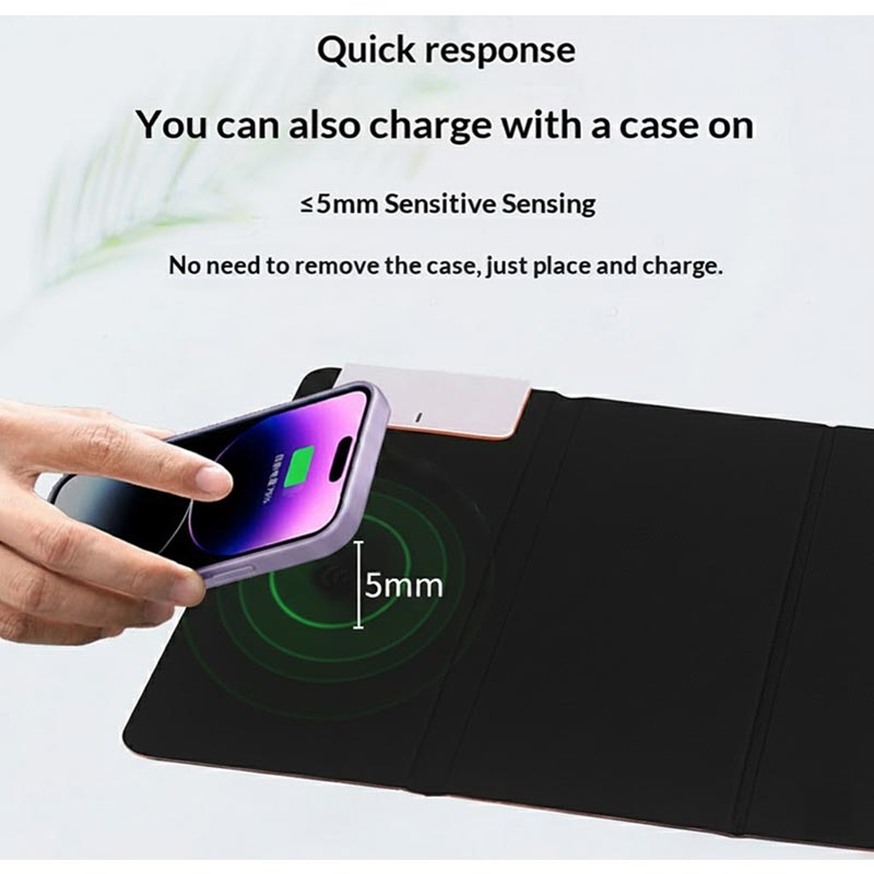 Sisäänrakennettu langaton latausmoduuli tukee jopa 15W:n pikalatausta, joka tuottaa nopeaa ja tehokasta virtaa yhteensopiviin älypuhelimiin. Äärimmäisen ohuen tunnistustekniikan (≤5 mm) ansiosta se lataa luotettavasti jopa useimpien puhelinkoteloiden läpi.