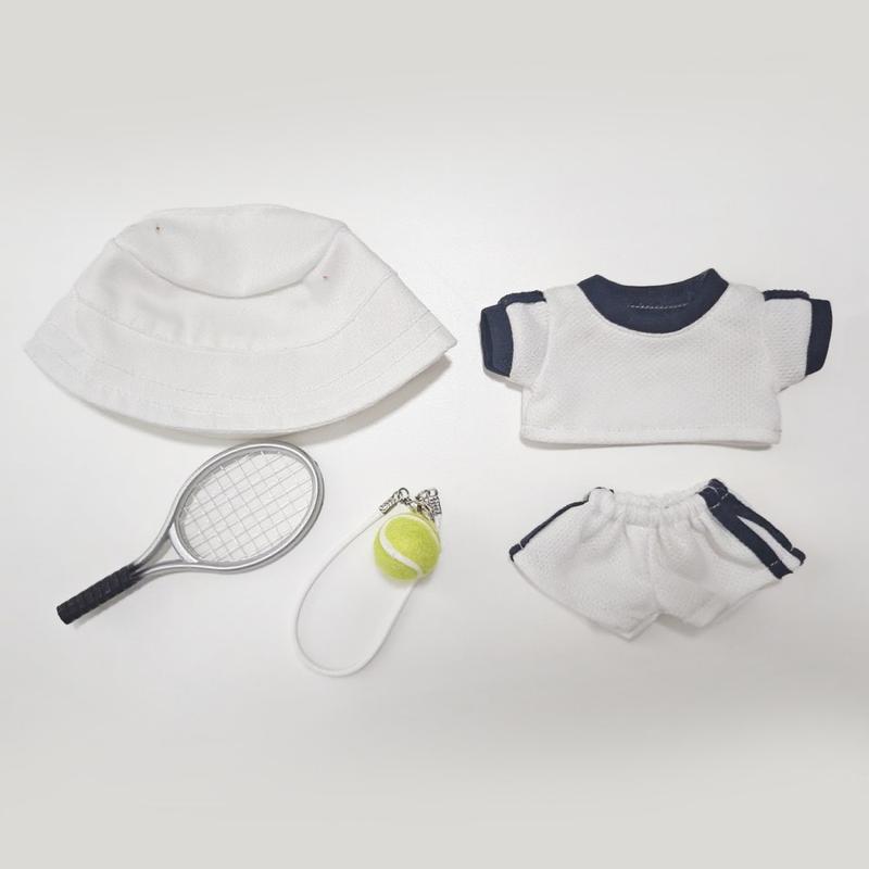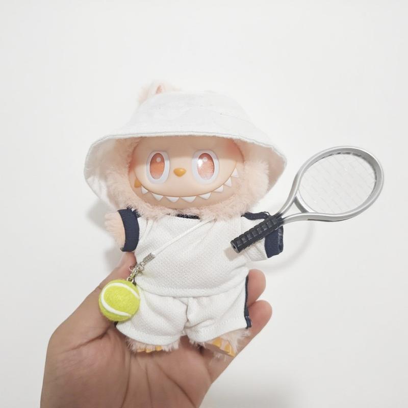 Tennis asu Labubu nukelle 17cm - 5 kpl. - T-paita, shortsit, hattu, tennismaila, tennispallo-viehätys.