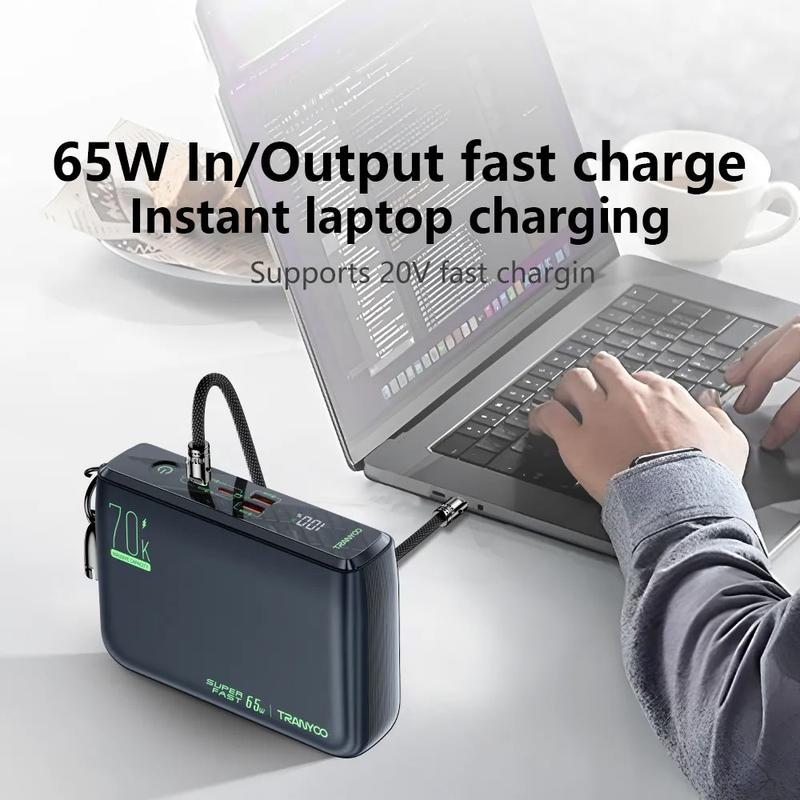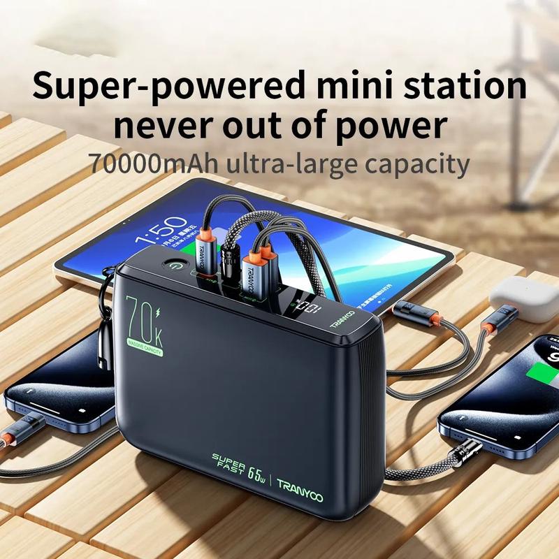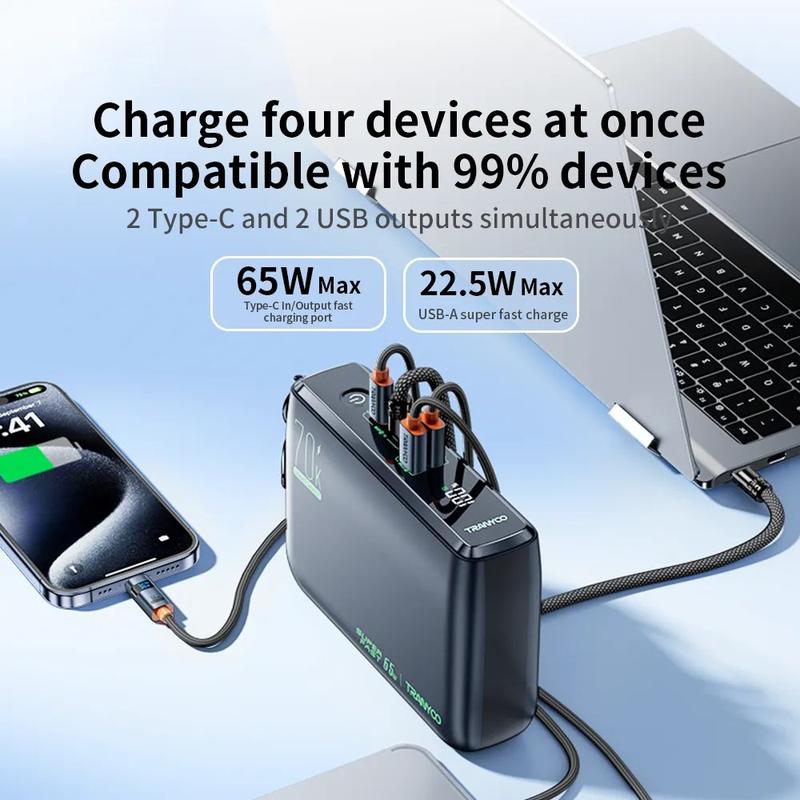 TRANYOO T-L7 yhdistää massiivisen 70000mAh:n kapasiteetin, kaksi 65W PD-pikalatausta, usean laitteen tuen ja kestävän, turvallisuuteen keskittyvän rakenteen - se on tehokas kannettava energiaratkaisu vaativille käyttäjille.