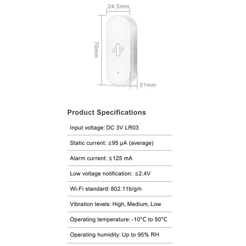 Saat välittömästi ilmoituksen, kun jotain liikutetaan, ravistellaan tai peukaloidaan. Tämä Tuya Smart WiFi -tärinäanturi yhdistyy suoraan 2,4 GHz:n WiFi-verkkoon ja lähettää reaaliaikaisia ilmoituksia Tuya Smart / Smart Life -sovellukseen aina, kun tärinää havaitaan. Se on yksinkertainen, kompakti turvalisälaite oville, ikkunoille, kassakaapeille, laatikoille, polkupyörille, kaappeille ja arvoesineille - auttaa sinua reagoimaan nopeasti, jos tapahtuu odottamatonta liikettä.