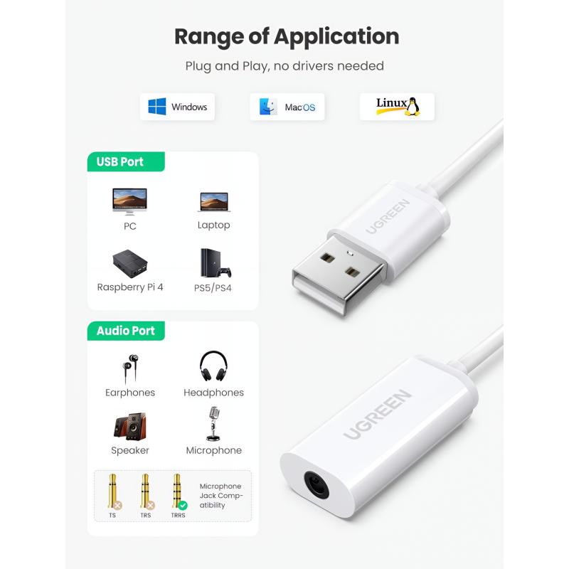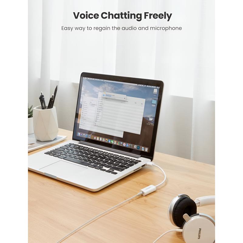 UGREEN US206 USB-äänisovitin lisää 3.5mm:n TRRS-kuulokeliitännän laitteisiin, joissa ei ole erillistä ääniliitäntää tai joiden liitäntä on vaurioitunut. Se tukee sekä äänilähtöä että mikrofonitulon kautta yhtä 3.5mm:n liitintä, mikä tekee siitä ihanteellisen kuulokkeille, verkkokokouksille, pelaamiselle ja päivittäiselle viestinnälle. Yksinkertaisen plug and play -toiminnon ja laajan järjestelmän yhteensopivuuden ansiosta se tarjoaa luotettavan ja kätevän ääniratkaisun ilman lisäajureita.