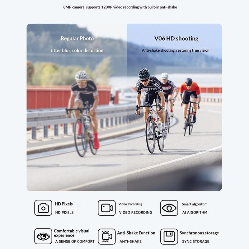 V06 AI Smart Glasses -älylasit yhdistävät handsfree-HD-tallennuksen, säänkestävän kestävyyden, stereoäänen ja älykkään äänikommunikoinnin yhdessä puettavassa laitteessa – ihanteellinen valinta pyöräilijöille, matkailijoille ja käyttäjille, jotka haluavat kätevän videotallennuksen ilman ylimääräisiä laitteita.