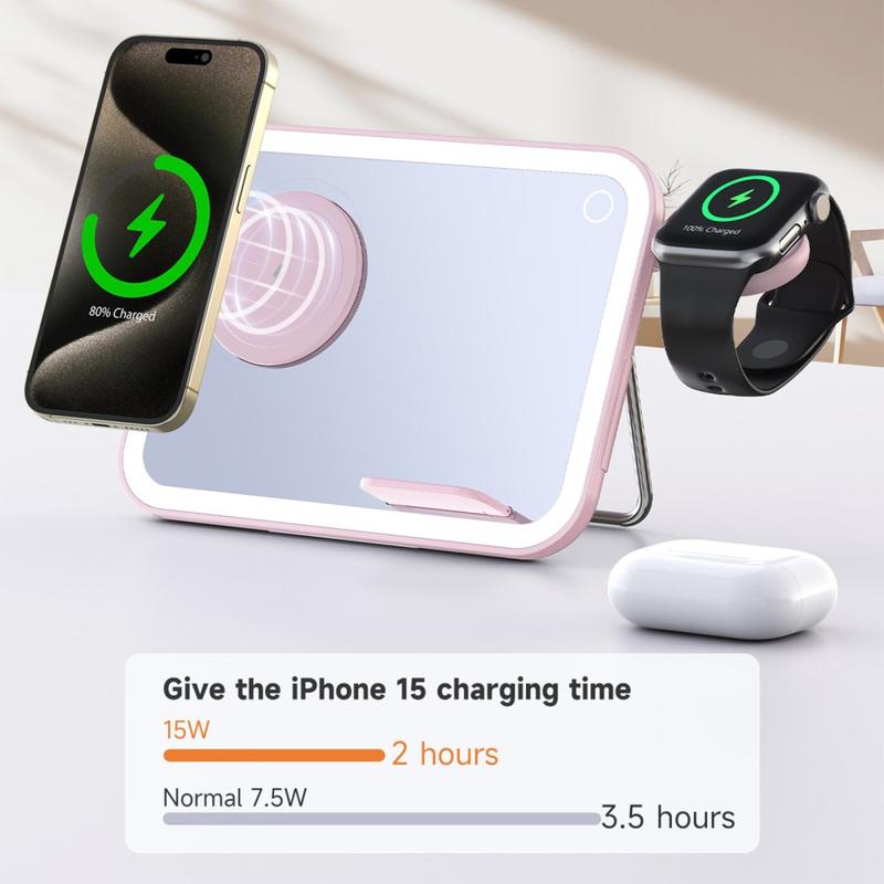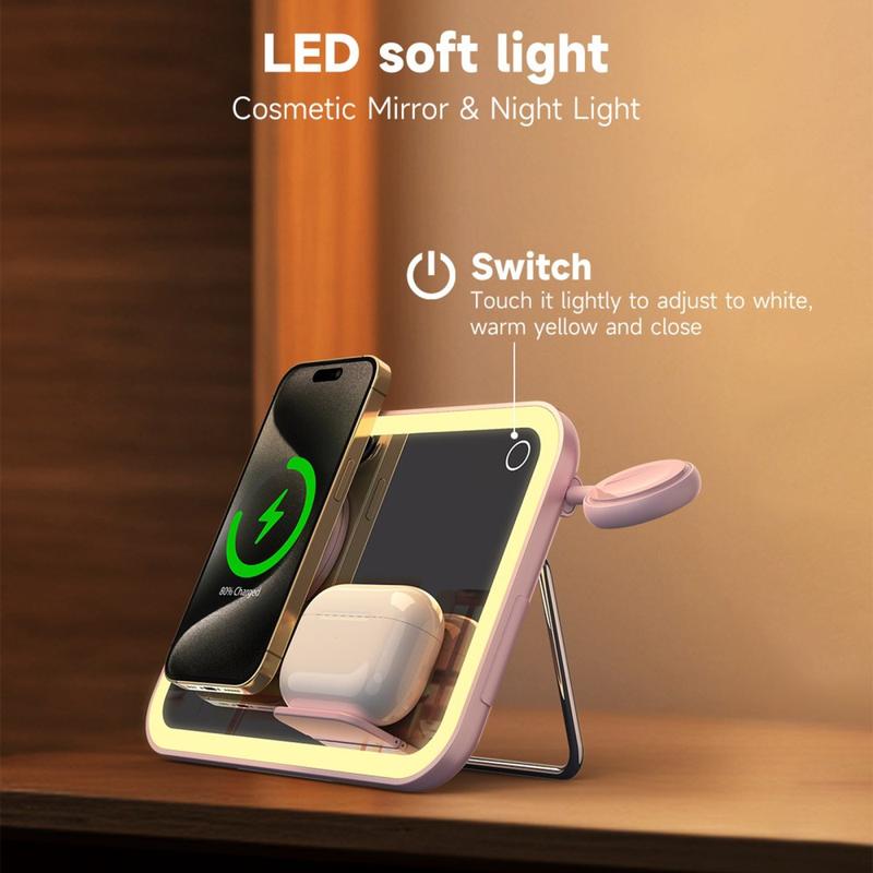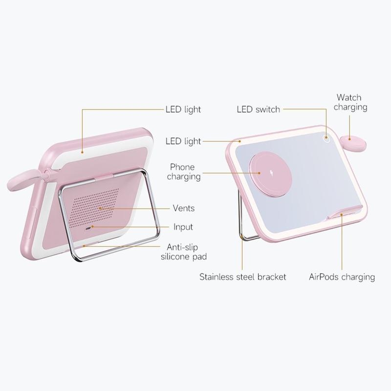 - 3-in-1-toiminnallisuus: Langaton laturi, LED-meikkipeili ja yövalo.