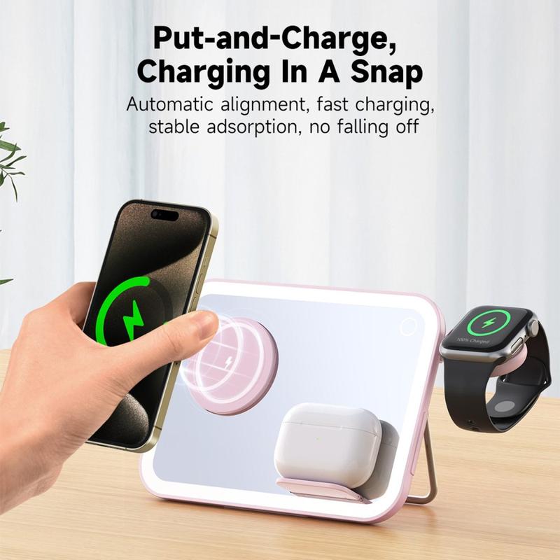 V22 3-in-1 Wireless Charger yhdistää MagSafe-yhteensopivan laturin, LED-meikkipeilin ja yövalon yhdessä tyylikkäässä laitteessa. Tämä monipuolinen vekotin on suunniteltu tarjoamaan mukavuutta ja toiminnallisuutta päivittäisissä rutiineissasi.