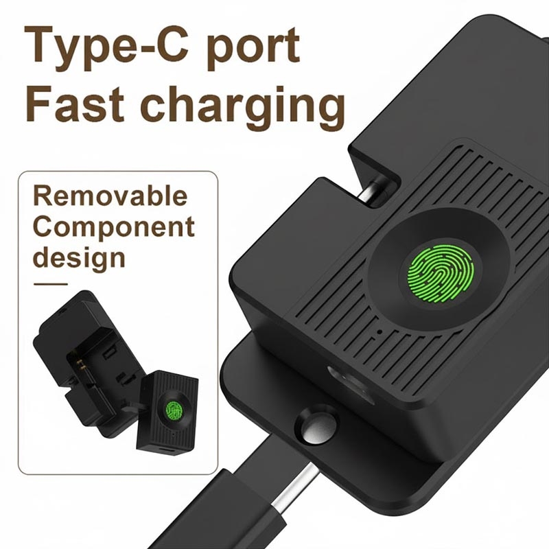 Älylukko on suunniteltu pieneen virrankulutukseen, ja se kestää jopa 10 kuukautta yhdellä latauksella (noin 5 lukituksen avauksella päivässä). Lataa nopeasti ja helposti USB-C-portin avulla, jolloin lukko on aina käyttövalmis.