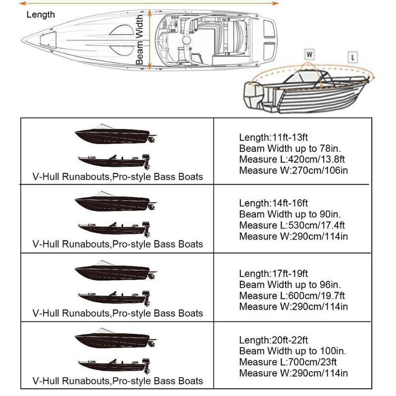 Suojaa veneesi kaikkina vuodenaikoina tällä kestävällä 210D-polyesteristä valmistetulla venepeitteellä, jossa on PU-pinnoite, joka suojaa luotettavasti sateelta, auringolta, pölyltä ja jokapäiväiseltä kulutukselta. Se on suunniteltu 20-22 jalan veneille (enintään 700 × 290 cm), ja se on käytännöllinen valinta säilytykseen, kiinnitykseen ja kuljetukseen. Integroitu hihnajärjestelmä, jossa on säädettävät vyöt ja pikalukot, auttaa pitämään suojuksen turvallisena, ja tuplasti ommellut saumat ja joustava helma takaavat tiukan, tuulenpitävän istuvuuden rungon ympärillä.