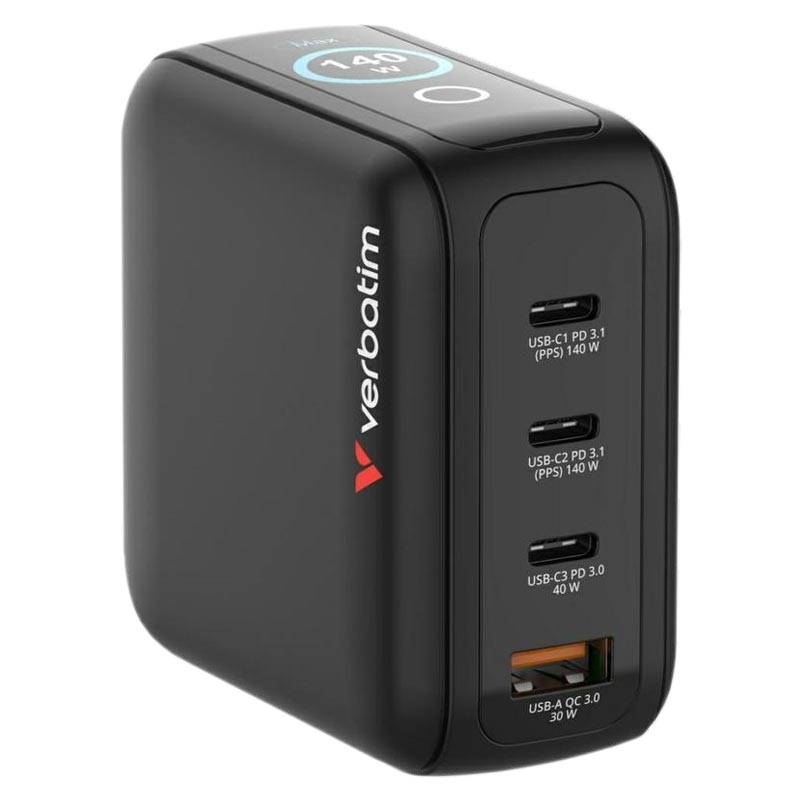 Verbatim Mini GaN -seinälaturi 140W, kosketusnäytöllä - 3 x USB-C + 1 x USB-A - EU/UK/US-pistokeliitännät