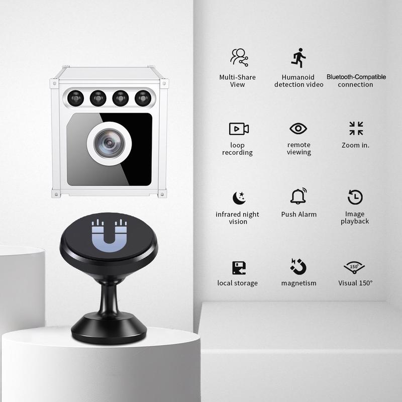 - Kompakti sisäkäyttöön tarkoitettu WiFi-turvakamera, jossa on magneettikiinnike joustavaan sijoittamiseen