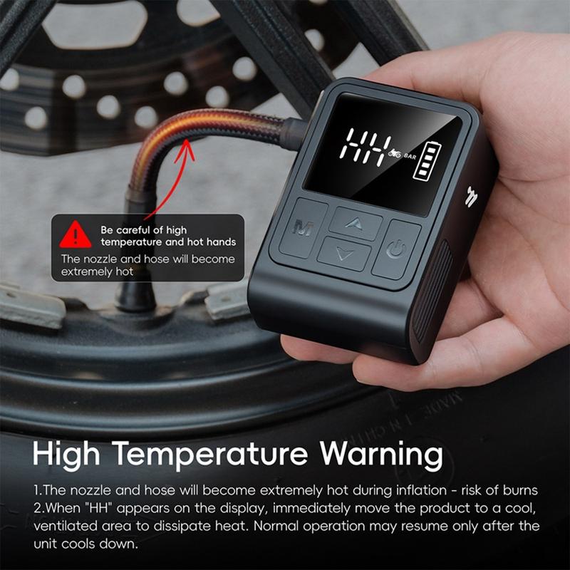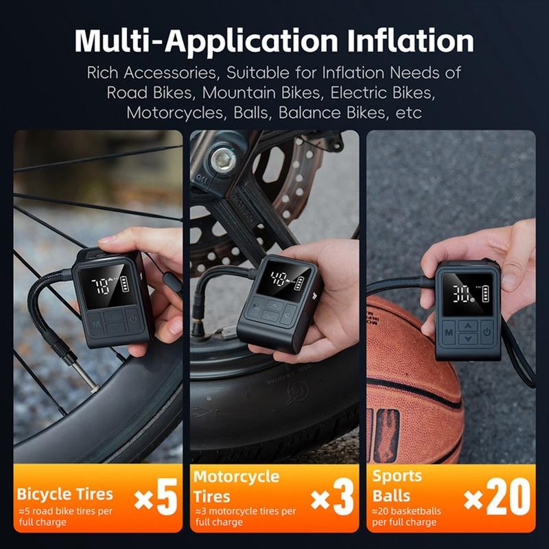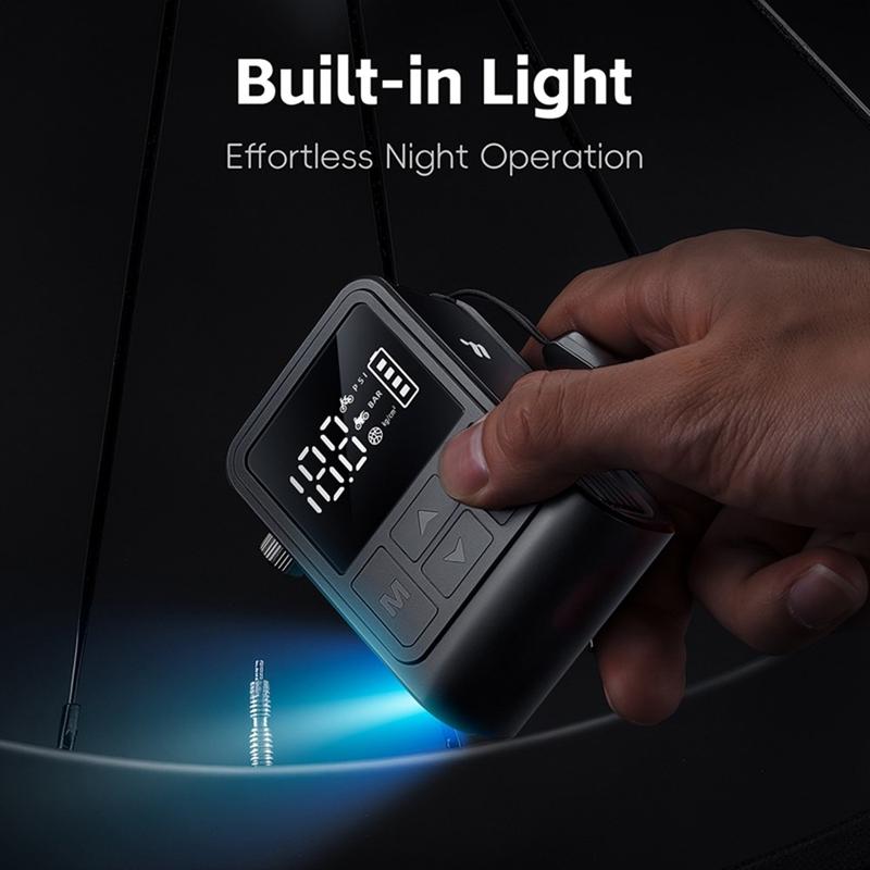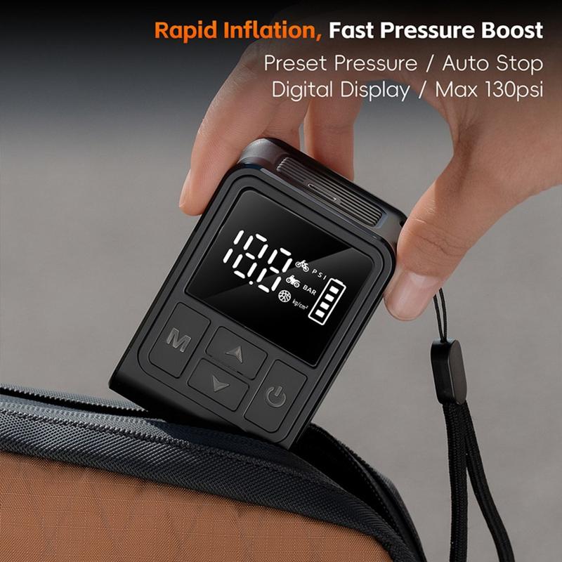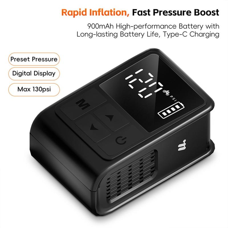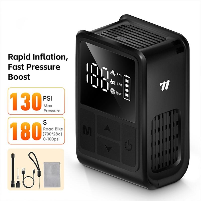 WEST BIKING YP0711196 High Pressure Electric Bike Pump on kompakti ja tehokas ilmakompressori, joka on suunniteltu pyöräilijöille, moottoripyöräilijöille ja jokapäiväisille käyttäjille. Tämä kannettava pumppu, jonka maksimikapasiteetti on 130 PSI, täyttää renkaat ja urheiluvälineet nopeasti ja helposti. Sisäänrakennettu digitaalinäyttö antaa tarkat reaaliaikaiset painelukemat, ja esiasetustoiminto pysäyttää puhalluksen automaattisesti, kun haluttu paine on saavutettu. Tämä pumppu toimii ladattavalla 900 mAh:n akulla, ja se tarjoaa mukavuutta, luotettavuutta ja siirrettävyyttä kotona tai matkalla käytettäväksi.