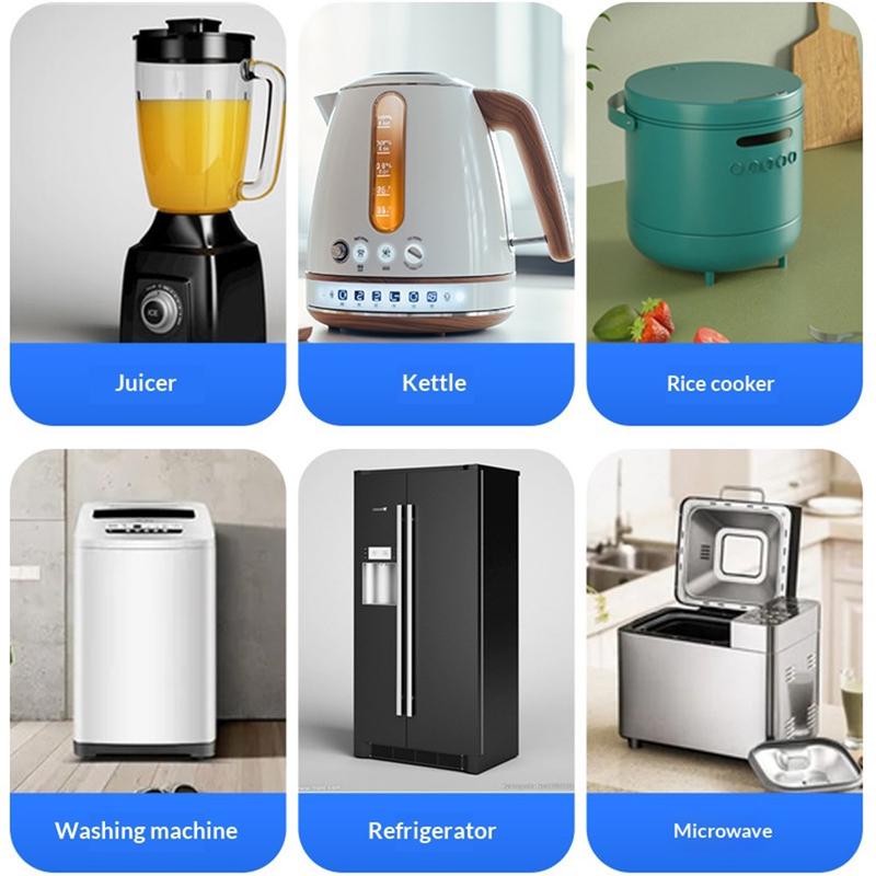- Sopii kodinkoneisiin, kuten vedenkeittimiin, lamppuihin, tuulettimiin, mehustimiin, riisinkeittimiin ja muihin kodinkoneisiin