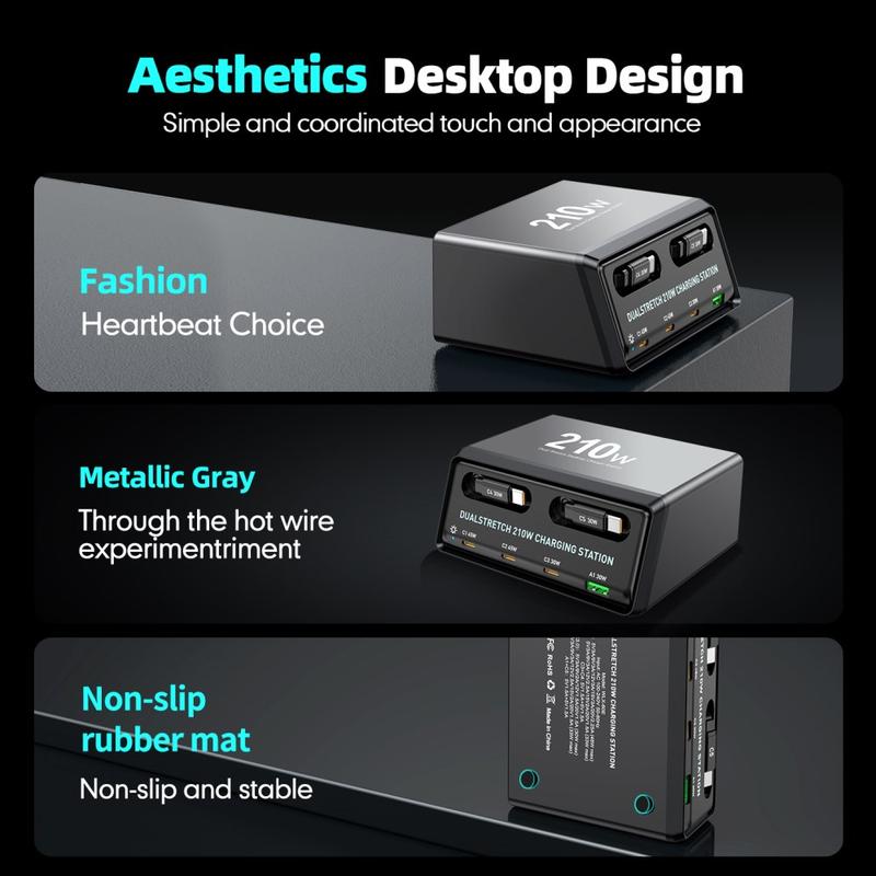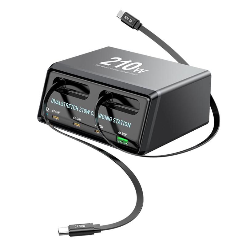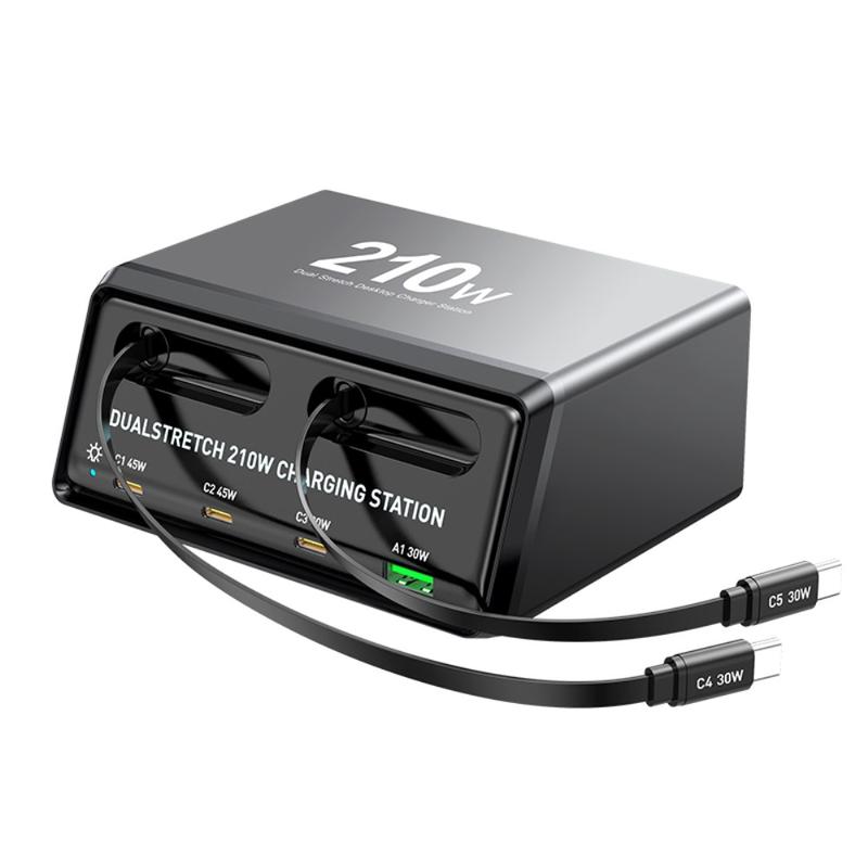 WLX-60E GaN-pöytälaturi - 2 x sisäänvedettävä USB-C-kaapeli + 3 x USB-C + USB-A, jopa 210W