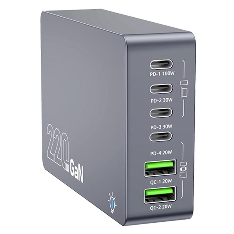 WLX-F8A 220W GaN pöytälatausasema - 6-porttinen pikalaturisovitin - EU-pistoke, 4x USB-C, 2x USB-A