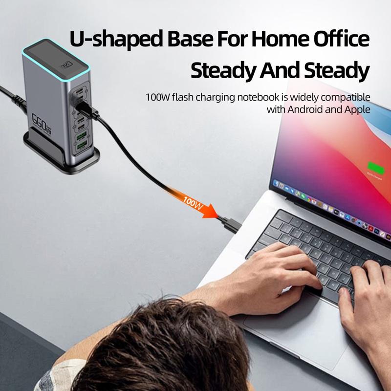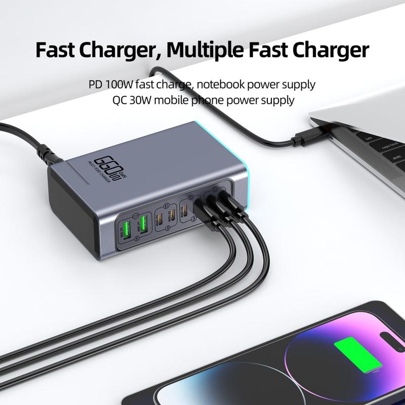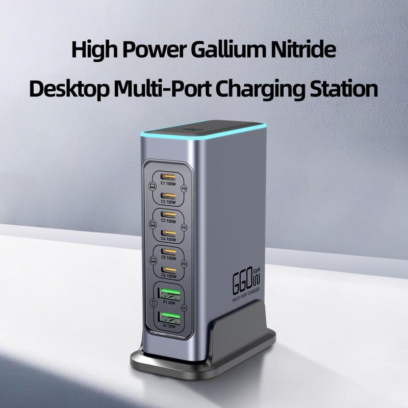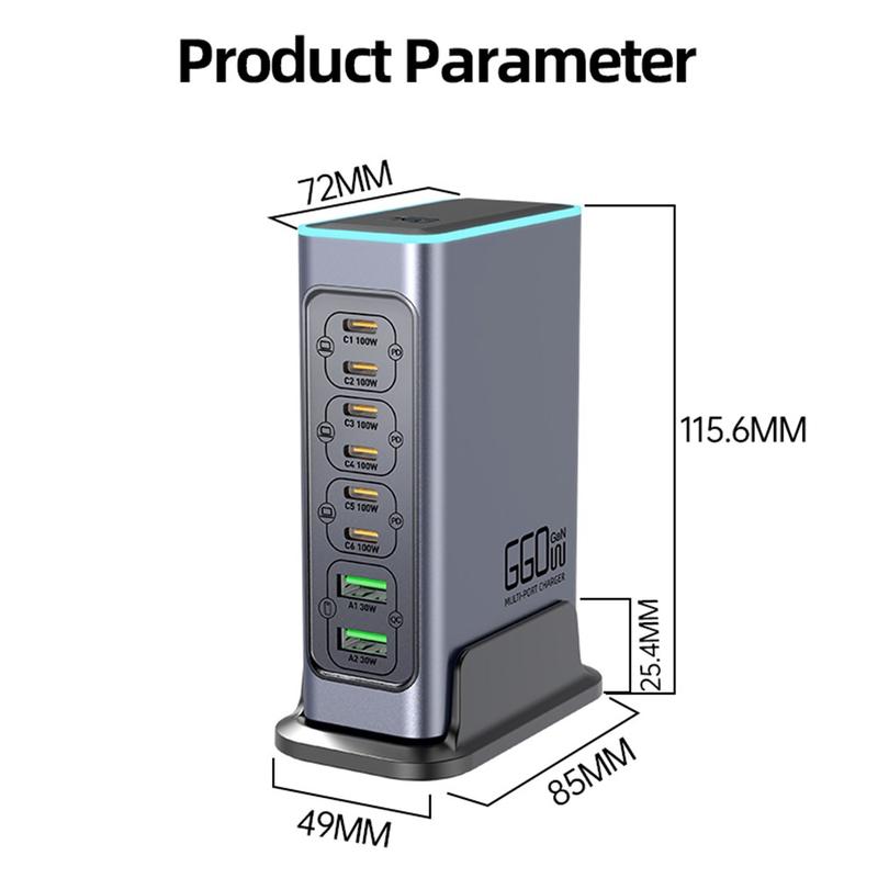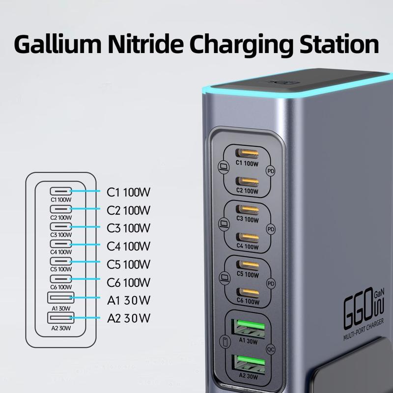 - Yhteensä 8 porttia: 6 x USB-C + 2 x USB-A useiden laitteiden samanaikaiseen lataamiseen