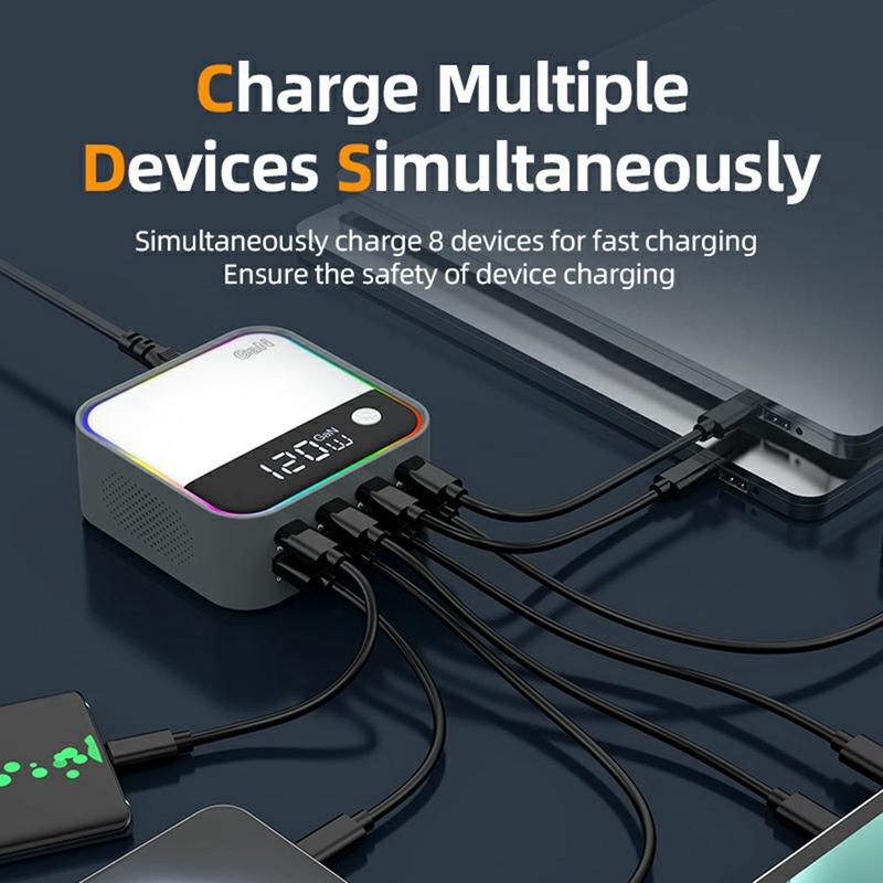 - 120W:n monilaitelataus, jossa on yhteensä 8 porttia (4 USB-C + 4 USB-A).