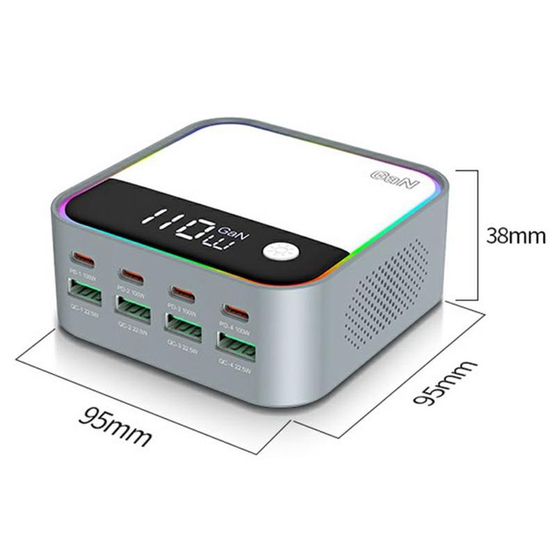 WLX-M8 120W pöytälatausasema RGB-valaistuksella - 8-porttinen GaN-pikalaturi 4x USB-C:llä, 4x USB-A:lla, EU-pistoke