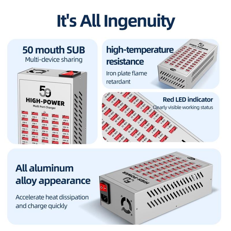 - 50 USB-porttia useiden laitteiden samanaikaiseen lataamiseen kaupallisissa ja teollisissa ympäristöissä