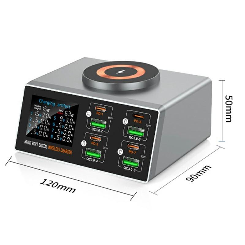 WLX-X9S 140W pöytälatausasema on tehokas 9-in-1-latauskeskitin, joka on suunniteltu käsittelemään kaikkia laitteitasi kerralla. Siinä on kahdeksan langallista porttia ja langaton magneettinen latausalusta, ja se korvaa useita sovittimia yhdellä kompaktilla pöytäratkaisulla.