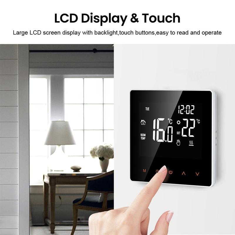 Suuri taustavalaistu LCD-kosketusnäyttö on helppo lukea sekä päivällä että yöllä. Sen tyylikäs yksiosainen muotoilu antaa termostaatille siistin ja modernin ilmeen, kun taas naarmuuntumaton pinta auttaa sitä pysymään edustavana pitkään. Voit valita manuaalisen tilan suoraa säätöä varten tai automaattitilan ohjelmoitua lämmitystä varten päivittäisen rutiinisi ja henkilökohtaisten mieltymystesi mukaan.