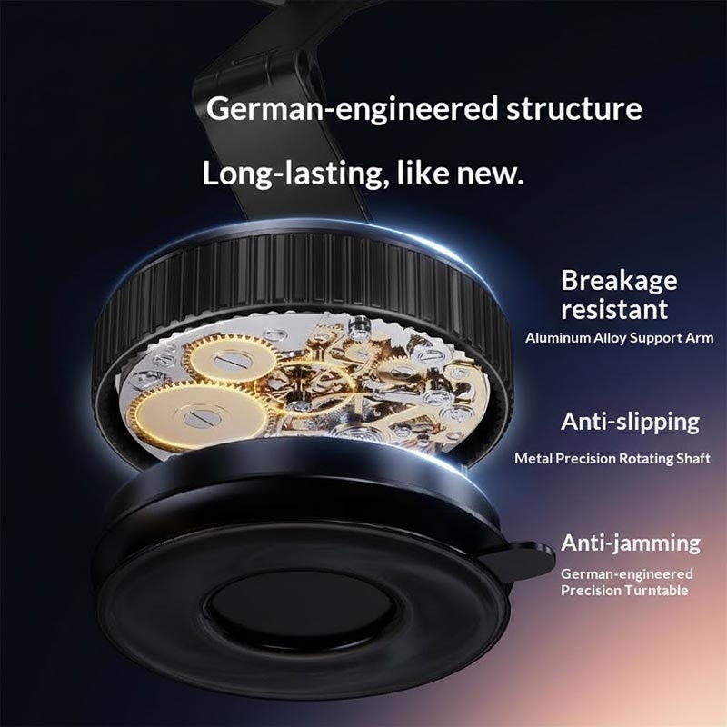 Kolmiosaisella alumiiniseosvarrella varustettu pidike tukee joustavaa säätöä useilla akseleilla: 360 asteen pohjan kierto, 240 asteen keskiliitoksen liike, 180 asteen ylälevyn säätö. Tämä mahdollistaa tarkan sijoittamisen navigointia, puheluita tai median katselua varten mistä tahansa kulmasta.