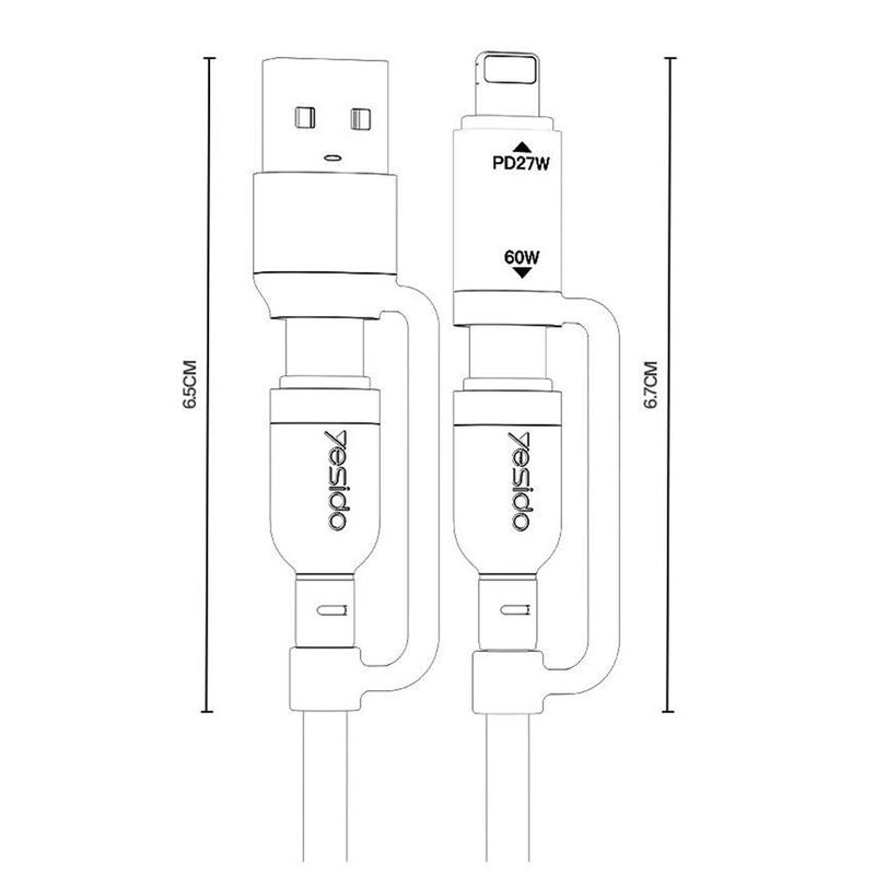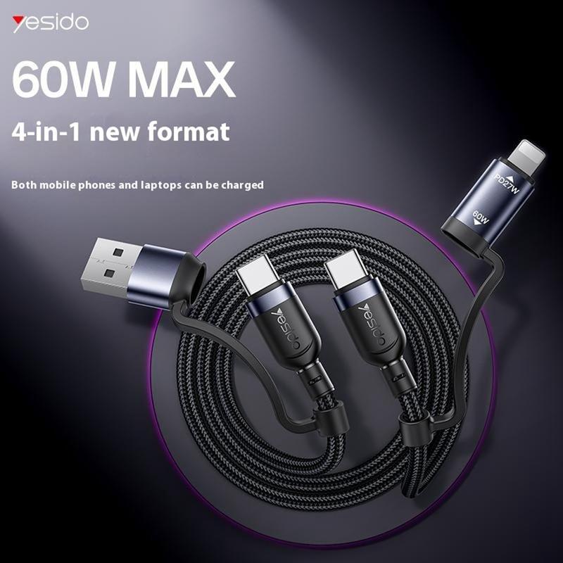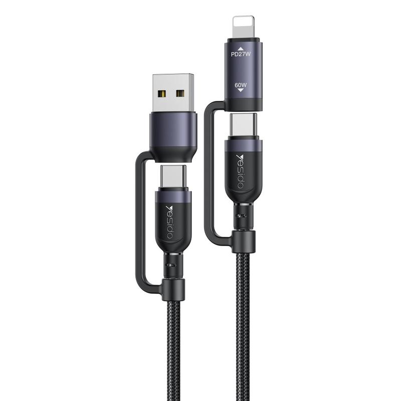 Yesido CA200 4-in-1-latauskaapeli - USB-A / USB-C - USB-C, Lightning (8-napainen) punottu pikalatauskaapeli, jopa 60 W, 1,2 m