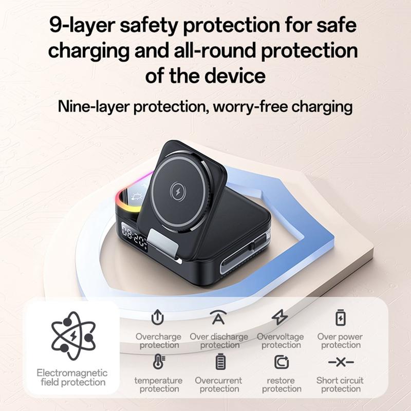 Päivitä työtilasi YESIDO DS38 -magneettisella langattomalla latausasemalla, joka on tyylikäs ja monikäyttöinen 8-in-1-latauslaite, joka on suunniteltu antamaan virtaa kaikille laitteillesi tehokkaasti. Pikalatauksen, digitaalisen kellon, RGB-ympäristövalaistuksen ja useita lähtöportteja yhdistävä laite on täydellinen all-in-one-työpöytävaruste puhelimille, älykelloille ja kuulokkeille.