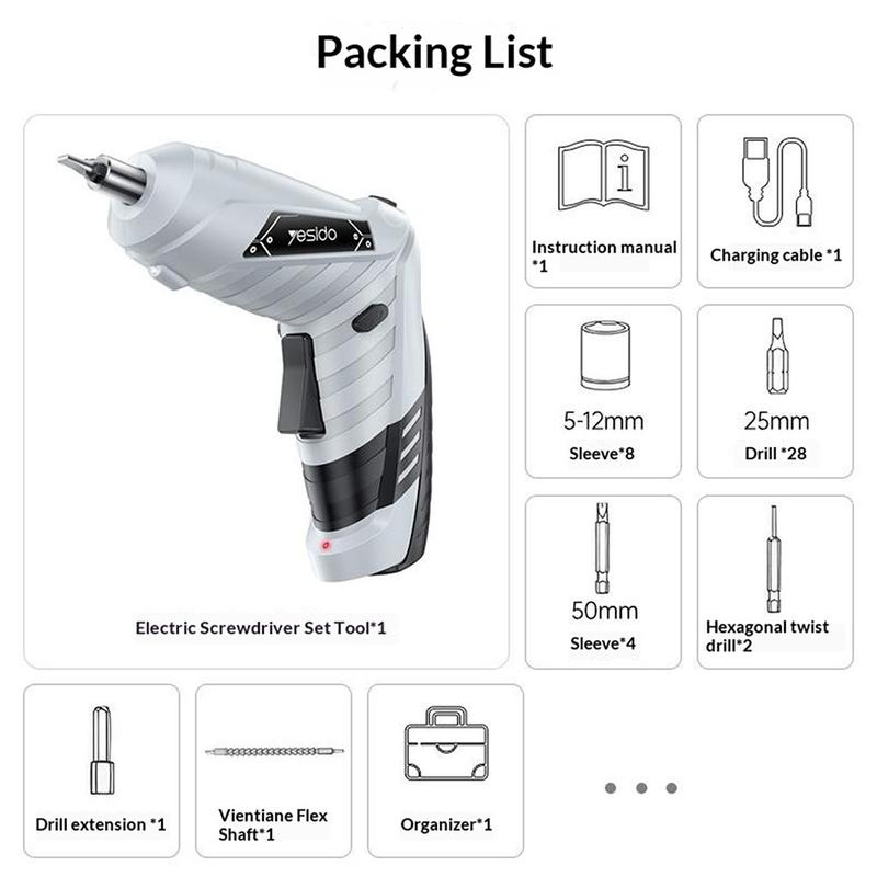 YESIDO EC34 -sähköruuvimeisselisarjan avulla arjen korjaustöistä tulee helpompaa. Tämä akkukäyttöinen työkalu on suunniteltu kotikäyttöön, tee-se-itse-projekteihin ja yleisiin huoltotöihin, ja se yhdistää käytännöllisen tehon, monipuolisen käytön ja kompaktin muotoilun yhdeksi kattavaksi kokonaisuudeksi. Sen kaksitoimisen rakenteen ansiosta voit vaihtaa suorasta ja pistoolimallisesta tilasta toiseen yhdellä painalluksella, mikä helpottaa työskentelyä sekä avoimissa tiloissa että ahtaammissa paikoissa.