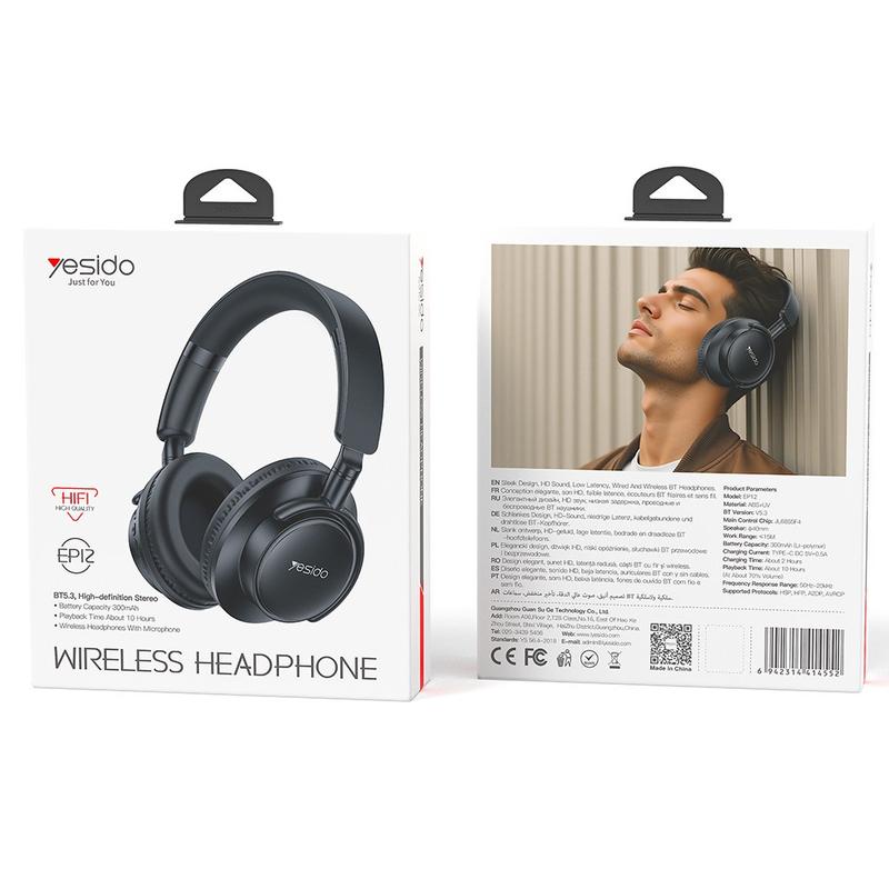 YESIDO EP12 on suunniteltu kevyellä ja ergonomisella rakenteella, ja se tarjoaa mukavuutta korvien yläpuolella ilman, että se lisää painetta korviin. Täydelliset pitkiin kuuntelusessioihin kotona, töissä tai matkoilla.