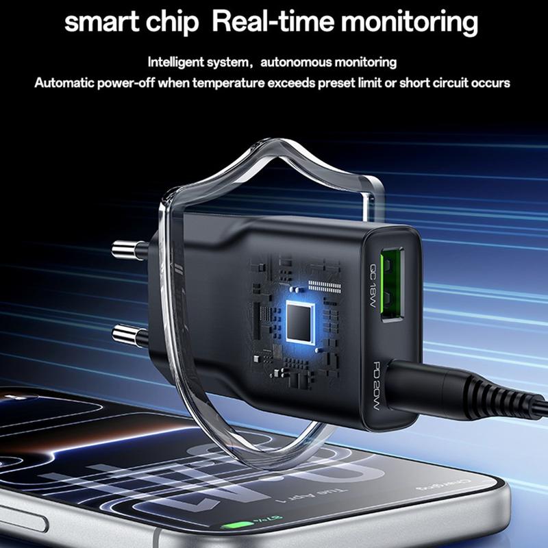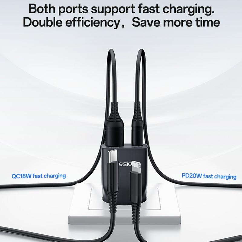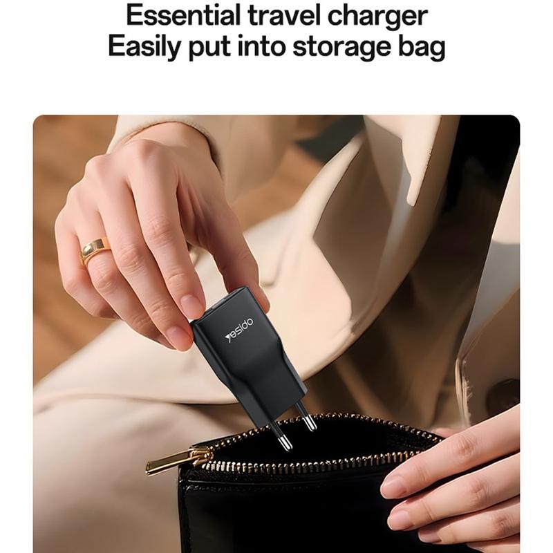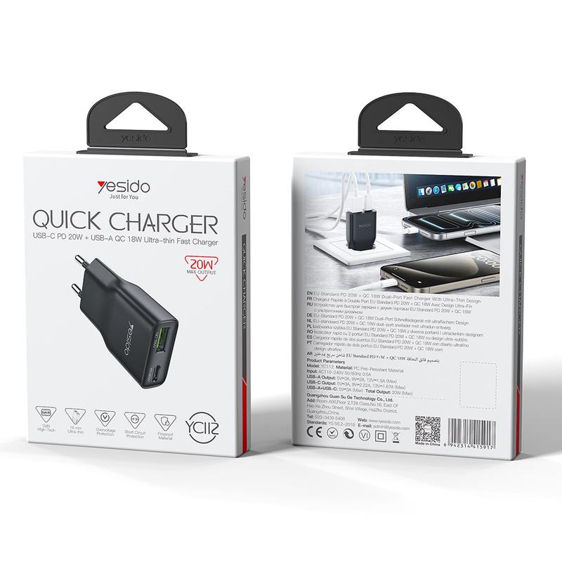 YESIDO YC112 20W:n kaksiporttinen pikalaturi - erittäin ohut USB-C/USB-A-seinäadapteri, PD ja QC, EU-pistoke