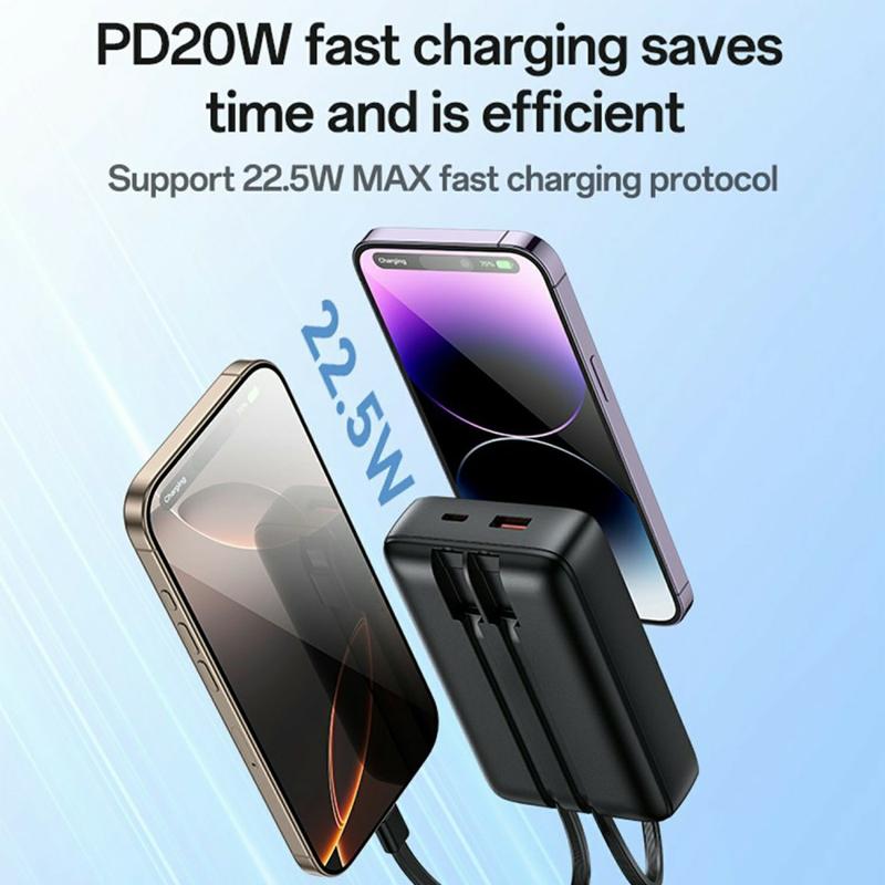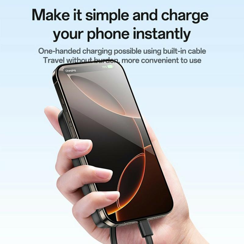 - Sisäänrakennetut kaapelit: Integroidut Type-C- ja Lightning- (Lightning-yhteensopiva) kaapelit takaavat, että olet aina valmis lataamaan ilman ylimääräisiä lisävarusteita.