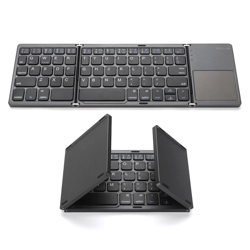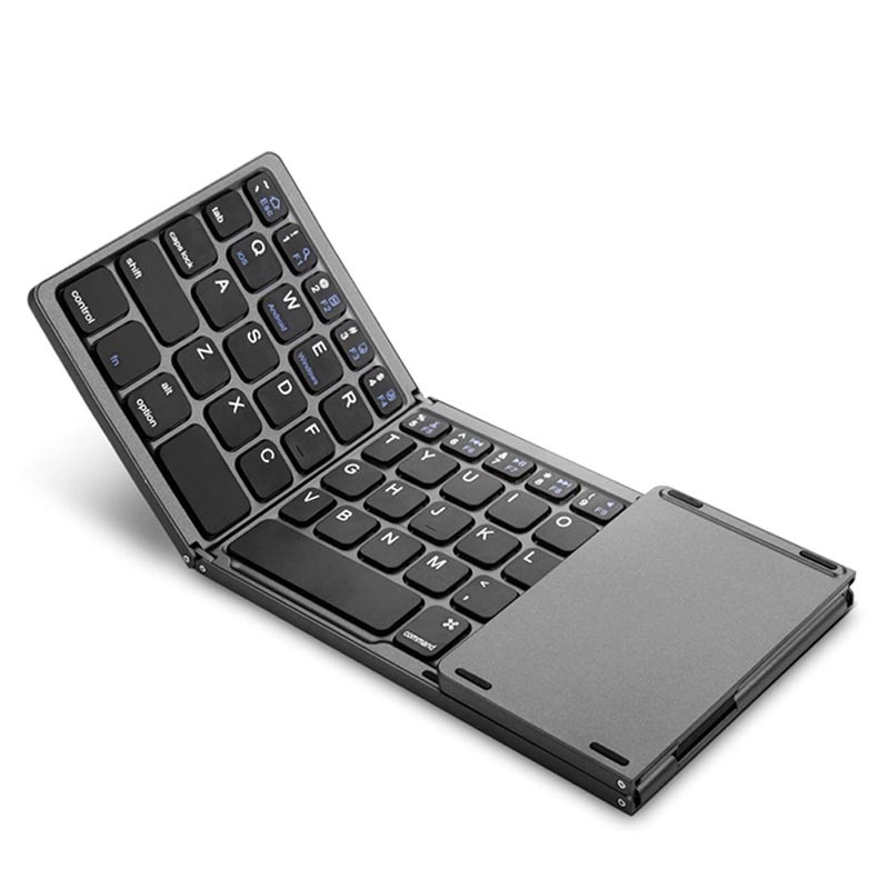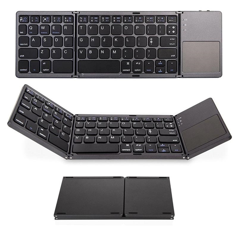 Tämä pieni ja ohut kosketuslevyllä varustettu Bluetooth-näppäimistö pystyy olemaan aina mukanasi. Sen taitettava muotoilu tekee siitä erittäin pienikokoisen ja helpon kuljettaa, minne tahansa. Bluetooth-tekniikka tarkoittaa, että sinun ei tarvitse varata arvokkaita USB-portteja langattomilla vastaanottimilla. Asentaminen on helppoa, eikä asennusta tai ajureita tarvita. Tämä erittäin ohut kaksinkertaisesti taitettava näppäimistö mukautuu helposti laukkuusi ja näppäimet pysyvät turvassa kestävän kaksinkertaisesti taittuvan rakenteen sisällä.