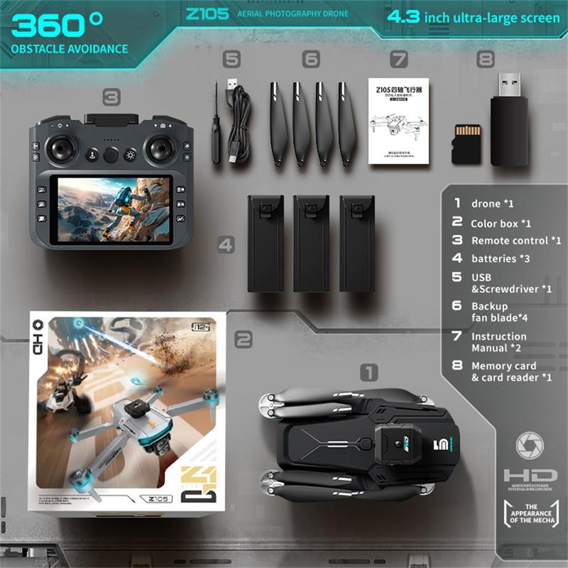 Z105 Dual-Camera Smart Drone 4.3" näytön ohjaimella ja 3 akulla - Harjaton moottori Esteiden välttäminen Quadcopterilla